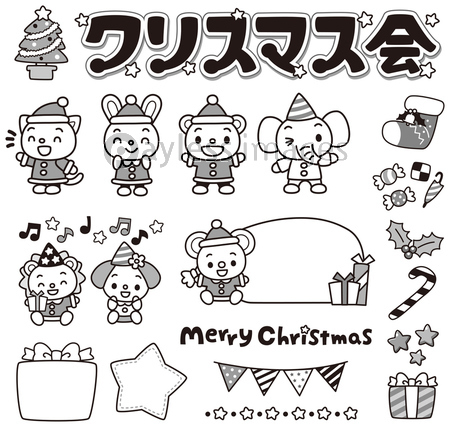 動物キャラクターとクリスマス 白黒の写真 イラスト素材